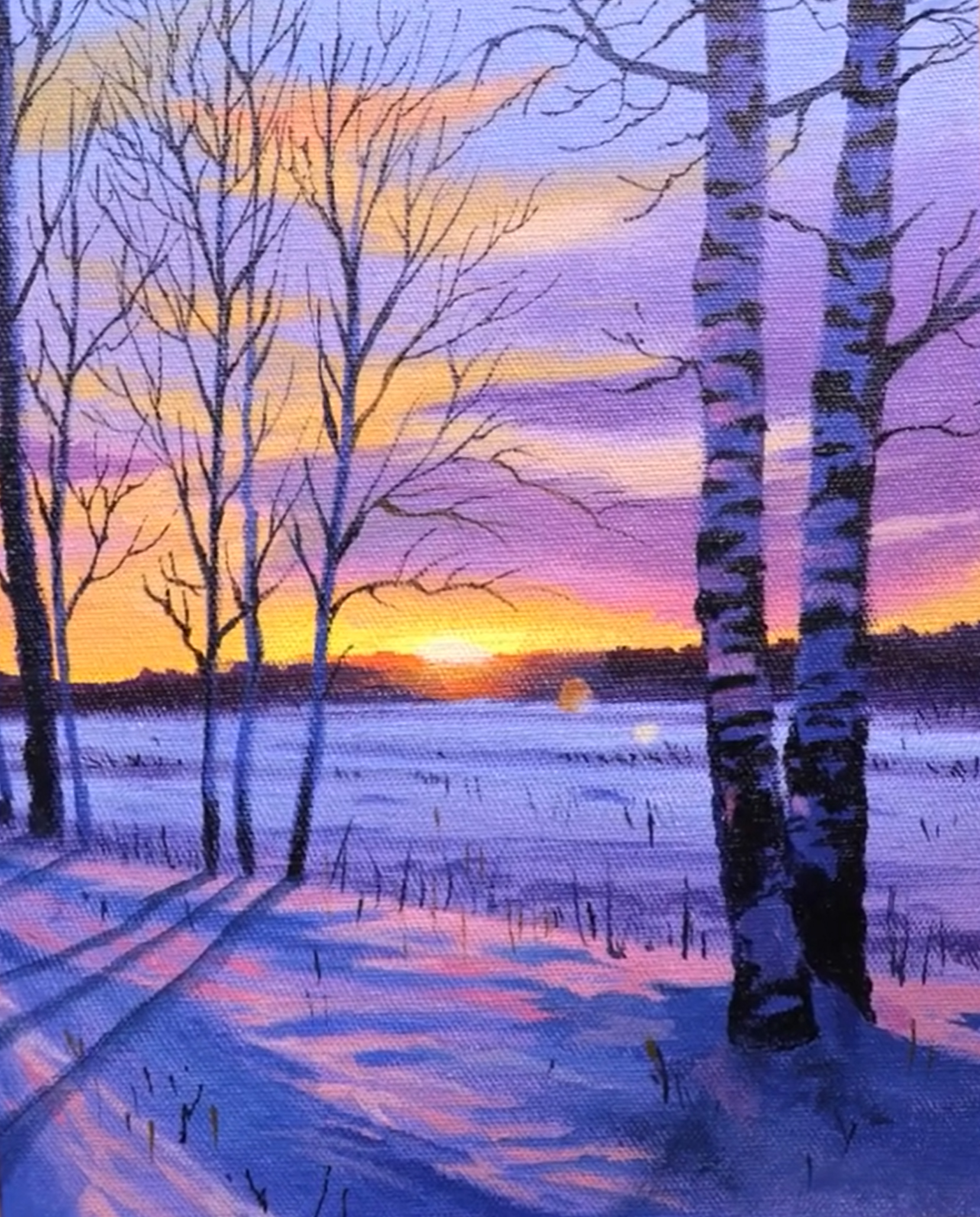 Obraz zachytáva magický moment zimného západu slnka, keď sa krajina ponára do jemných fialových, ružových a zlatistých tónov. Snehom pokrytá lúka odráža posledné lúče slnka, zatiaľ čo siluety brezových stromov vrhajú dlhé tiene do pokojnej krajiny. Kontrast teplého svetla na horizonte a chladných odtieňov snehu vytvára harmonickú atmosféru pokoja a stíšenia. Dielo evokuje ticho zimného […]